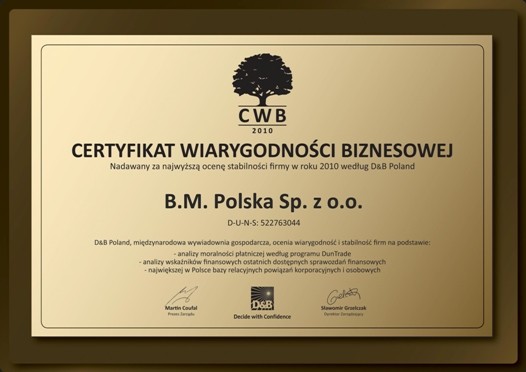Certyfikat Wiarygodności Biznesowej to prestiżowe wyróżnienie przyznawane przez międzynarodową firmę Dun & Bradstreet, która specjalizuje się w sporządzaniu raportów handlowych na temat firm na całym świecie Od 170 lat dostarcza ona usługi i wiedzę niezbędne do podejmowania pewnych i bezpiecznych decyzji biznesowych. Certyfikat Wiarygodności Biznesowej przyznawany jest wyłącznie firmom, których dane finansowe dają gwarancję wysokiego poziomu rentowności, zdolności i płynności finansowej, a poziom zadłużenia oraz zarejestrowanych przeterminowanych płatności jest znikomy. Podstawą do oceny firmy jest analiza moralności płatniczej według programu DunTrade®, analiza wskaźników finansowych ostatnich dostępnych sprawozdań finansowych oraz największa w Polsce baza relacyjnych powiązań korporacyjnych i osobowych. Certyfikat Wiarygodności Biznesowej stanowi gwarancję, że jego właściciel jest wiarygodnym kontrahentem, z którym warto nawiązywać kontakty handlowe. Wyróżnienie przyznawane przez Dun & Bradstreet Poland, honorowane jest na całym świecie i przyczynia się do zwiększenia atrakcyjności rynkowej firmy. Na podstawie raportu za rok 2010 na wyróżnienie Certyfikatem Wiarygodności Biznesowej zasłużyło ok. 600 polskich firm, w tym m.in. B.M. Polska wyłączny dystrybutor farb marki Benjamin Moore. Jest to kolejna prestiżowa nagroda dla firmy, która w ubiegłym roku uhonorowana została „Diamentem” Forbesa, przyznawanym polskim przedsiębiorstwom, które najszybciej zwiększają swoją wartość. B.M. Polska jest jednym z liderów rynku w segmencie sprzedaży ekskluzywnych produktów wykończenia wnętrz, a w swoim portfolio ma renomowane marki takie jak Benjamin Moore, Candis, Blue Mountain, czy Richard. Firma posiada salony firmowe w Warszawie, Krakowie, Wrocławiu i Gdyni oraz sieć ponad 40 współpracujących z nią punktów dystrybucyjnych w całej Polsce.