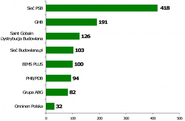 Zródło: badania ASM, raport Dystrybucja materiałów budowlanychLiczba punktów dystrybucyjnych wybranych hurtowni i składów budowlanych w 2011 roku (wg liczby placówek; stan na 09/2011)