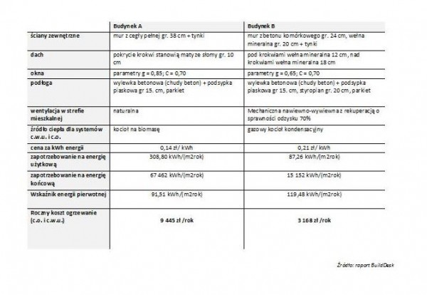 Analizując dwa obiekty o tej samej powierzchni, o różnych systemach grzewczych (gaz i biomasa) oraz innych grubościach izolacji zauważyć można, że budynki o zbliżonych parametrach charakterystyki energetycznej (wskaźnik energii pierwotnej) różnią się znacząco w kwestiach kosztów eksploatacji.