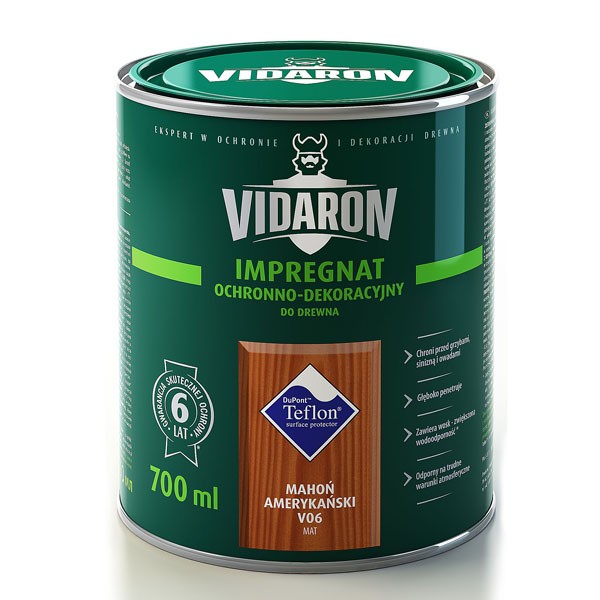 Potwierdzeniem tego jest 6-letnia gwarancja na wymalowania wykonane tym impregnatem. Produkt ten głęboko wnika w drewno i chroni je szkodliwym działaniem czynników biologicznych i atmosferycznych, jednocześnie nadaje drewnu odpowiedni kolor podkreślający usłojenie. Dodatkowo Impregnat VIDARON zawiera unikalny dodatek w postaci Teflon® surface protector, dzięki jego zawartości drewno w większym stopniu zabezpieczone jest przed działaniem wody, wilgoci oraz promieniowania UV. Produktem możemy malować elementy architektury ogrodowej, drewno konstrukcyjne, płoty, mebel ogrodowe, fasady budynków itp.