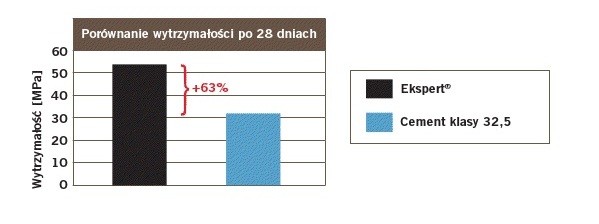 Ekspert to cement portlandzki wieloskładnikowy o podwyższonej klasie wytrzymałości ponad 42,5 MPa – stosowany wszędzie tam, gdzie musimy uzyskać wytrzymałe i trwałe betony w bardzo krótkim czasie. Oznaczenia normowe cementu to CEM II /B-M (S-V) 42,5N – z dodatkiem popiołu lotnego krzemionkowego (V) i żużla wielkopiecowego (S) (cementownia „Małogoszcz”) lub CEM II/B-V 42,5N – z dodatkiem popiołu lotnego krzemionkowego (V) (cementownia „Kujawy”). Dzięki wysokiej wytrzymałości wczesnej oraz końcowej produkt ten idealnie sprawdza się do przygotowania betonów wysokich klas C16-C45 na placu budowy, na konstrukcje stropów, wieńców, belek, schodów i nadproży. Doskonale nadaje się także na fundamenty, posadzki czy prefabrykaty. Jego właściwości pozwalają na przyspieszenie tempa prac budowlanych, szybszą rotację form i szalunków. Podwyższona urabialność ułatwia lepsze wypełnianie form i szalunków oraz poprawia pompowalność mieszanki betonowej. Dzięki odpowiednio dobranej kompozycji składników mineralnych użycie cementu Ekspert zmniejsza ryzyko pojawienia się rys skurczowych, pustek i raków czy wykwitów na gotowych elementach.