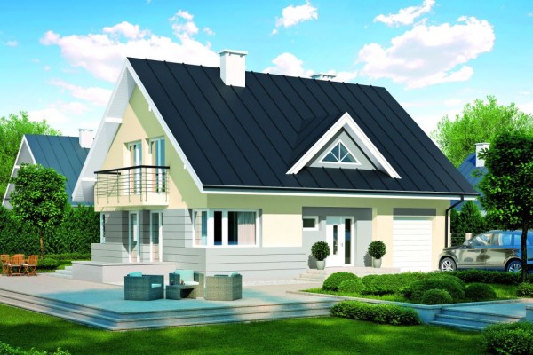 Propozycja 3. Zastosowane kolory FOVEO TECH: Tynk 1: 190 F, Tynk 2: 500 F, Tynk mozaikowy: MD 25 Dach: grafitowy; Stolarka: biały; Projekt domu: Meteor 2.