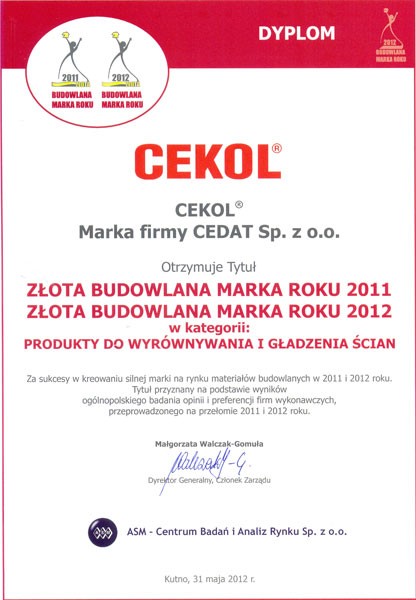 Dyplom Złota Budowlana Marka Roku 2012Nagroda jest tym bardziej cenne, że przyznawana przez wykonawców, którzy na co dzień pracują przy użyciu tych produktów i to dowód uznania niezawodności i wysokiej jakości wyrobów marki CEKOL-podsumowuje Piotr Kuryś, dyrektor handlowy firmy Cedat.