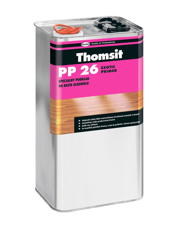 Specyficzne substancje zawarte w drewnie egzotycznym mogą wchodzić w reakcję z lakierami nawierzchniowymi, powodując powstawanie plam i przebarwień na parkiecie. Aby ustrzec się przed takimi niespodziankami, konieczne jest zastosowanie specjalnego podkładu pod lakier nawierzchniowy. Ma on czuwać, żeby związki chemiczne zawarte w drewnie nie przenikały do ochronnej i dekoracyjnej, wierzchniej warstwy lakieru. Takie zabezpieczenie gwarantuje Thomsit PP 26. Nowoczesny, jednoskładnikowy lakier podkładowy na bazie alkoholu świetnie sprawdzi się jako ochrona parkietu bez względu na gatunek drewna, choć szczególnie polecany jest do drewna egzotycznego i wymagających gatunków owocowych. Podkład głęboko wnika w pory drewna, uniemożliwiając przedostawanie się aktywnych chemicznie substancji do lakieru nawierzchniowego.