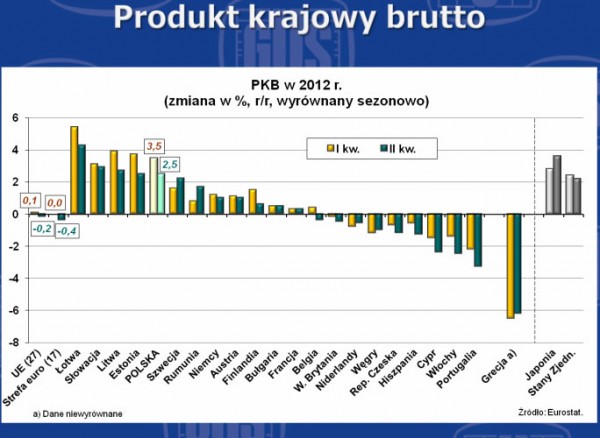 W II kwartale 2012 r. PKB wyrównany sezonowo (w cenach stałych przy roku odniesienia 2005) wzrósł realnie o 0,4 % w porównaniu z poprzednim kwartałem i był wyższy niż przed rokiem o 2,5 %.