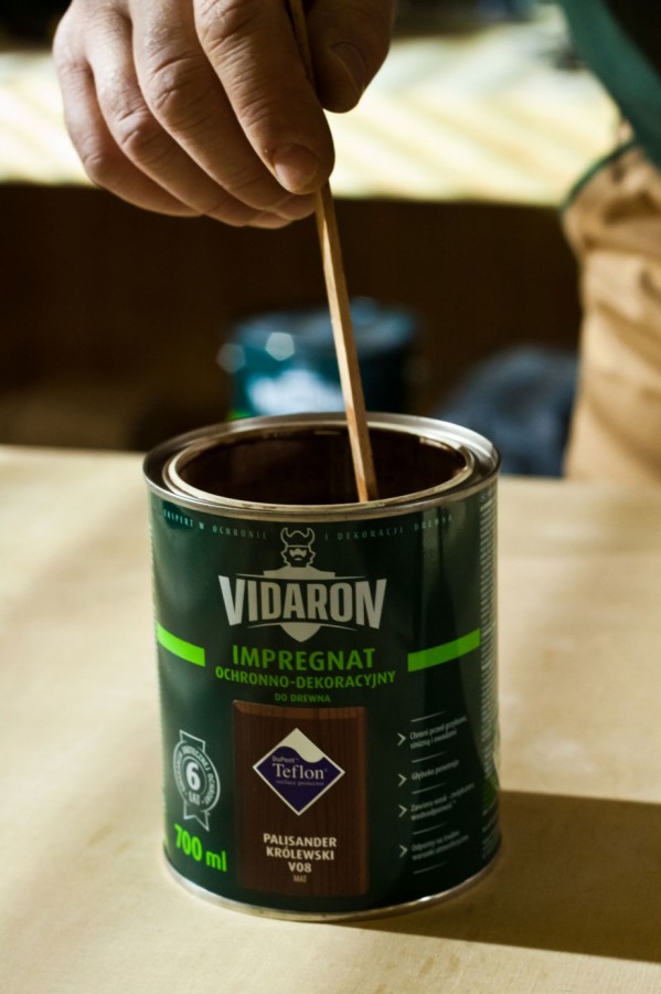 Na tak przygotowanej powierzchni drewna rozpoczynamy impregnację preparatu. Do impregnacji można wykorzystać VIDARON Impregnat Ochronno-Dekoracyjny z dodatkiem Teflon® surface protector. Zabezpiecza on drewno na zewnątrz i od wewnątrz, jednocześnie nadając drewnianym elementom eleganckie matowe wykończenie i podkreślając usłojenie drewna. Drewniane elementy, które będą narażone na bezpośrednie działanie warunków atmosferycznych najlepiej zabezpieczyć wcześniej warstwą bezbarwnego Impregnatu Ochronno-Dekoracyjnego VIDARON. Impregnat bezbarwny pozbawiony jest pigmentów, dzięki temu głęboko wnika w drewno i zapewnia pełną ochronę przed zagrożeniami biologicznymi – grzyby, owady, pleśń.