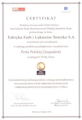 Śnieżka po raz kolejny znalazła się w gronie Pereł Polskiej Gospodarki, potwierdzając tym samym swoją stabilną, mocną pozycję na rynku. Jak zaznaczyli organizatorzy, o przyznaniu tytułu FFiL Śnieżka, zdecydowały: „konsekwentna realizacja polityki i strategii przedsiębiorstwa oraz pozycja lidera wśród najbardziej dynamicznych i najbardziej efektywnych przedsiębiorstw w Polsce”. Ranking „Perły Polskiej Gospodarki” charakteryzuje się metodologią, która zwiększa obiektywizm oceny. Pozycja firmy na liście rankingowej zależy nie tylko od wielkości przedsiębiorstwa mierzonego wartością przychodów ogółem, ale także od jego efektywności, dynamiki i płynności finansowej. W rankingu ocenianych jest około 1000 przedsiębiorstw, których przychody przekraczają 100 mln zł (Perły Duże). Patronat Honorowy nad rankingiem sprawują Wicepremier i Minister Gospodarki Waldemar Pawlak i Prezes Polskiej Akademii Nauk prof. Michał Kleiber.