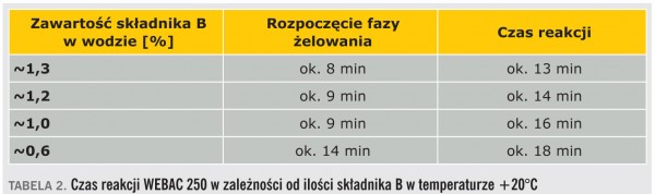 tabela 2. Czas reakcji WEBAC 250 w zależności od ilości składnika B w temperaturze +20°C