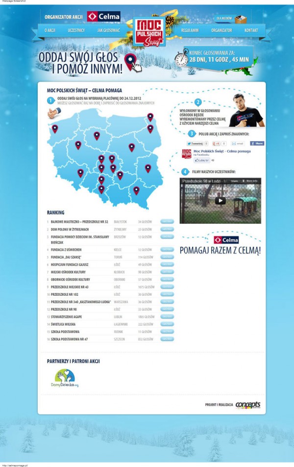 Ruszył projekt społeczny MOC POLSKICH ŚWIĄT, którego pomysłodawcą jest Celma – jedyny polski producent narzędzi i elektronarzędzi. W pierwszym etapie podmioty ukierunkowane na pomoc innym, a których budynki wymagają renowacji, zgłaszały się do organizatorów akcji. Spośród szesnastu wytypowanych projektów Internauci mogą teraz wybrać jeden, który przejdzie prawdziwą metamorfozę, dzięki pracownikom polskiego producenta. Głosowanie rozpoczęło się 26 listopada, a uroczyste ogłoszenie wyników nastąpi 24 grudnia br.