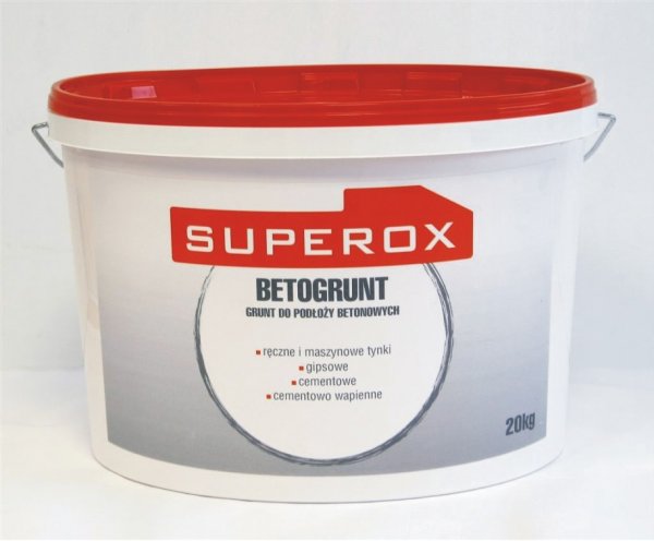 Superox Betogrunt jest profesjonalnym preparatem gruntującym przeznaczonym do stosowania na wszelkiego rodzaju podłożach betonowych oraz na innych podłożach, takich jak: jastrychy cementowe, płyty gipsowe i gipsowo-kartonowe, tynki cementowe i cementowo-wapienne. Jest stosowany w celu zwiększenia przyczepności międzywarstwowej kolejno nakładanych warstw materiałów budowlanych w postaci: tynków gipsowych, cementowych, cementowo-wapiennych oraz wszelkich innych cienko- i grubowarstwowych zapraw budowlanych, mas tynkarskich, mas oraz gładzi na bazie mieszanek gipsowych i cementowych. Polecany szczególnie na podłoża, stare, zabrudzone zaschniętymi materiałami pochodzenia nieorganicznego. Doskonale nadaje się na posadzki betonowe, gwarantując bardzo dobrą przyczepność kolejnych warstw powłok ochronnych.
