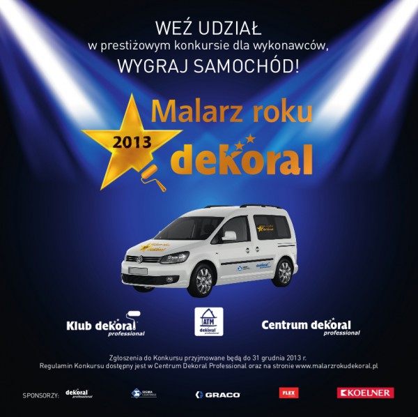 Jeszcze do końca grudnia przyjmowane będą zgłoszenia do konkursu Malarz Roku Dekoral 2013, organizowanego przez firmę PPG Deco Polska, lidera na polskim rynku farb i lakierów. Na zwycięzców czekają atrakcyjne nagrody: Volkswagen Caddy oraz profesjonalne narzędzia ufundowane przez firmy Graco, Flex i Koelner.