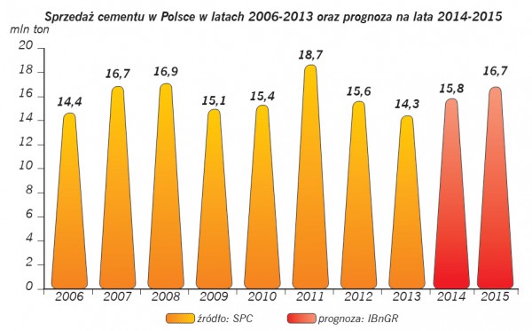 W 2013 roku sprzedaż cementu w Polsce wynosiła 14,3 mln ton i była mniejsza o 8% w stosunku do roku 2012. W 2014 r. Instytut Badań nad Gospodarką Rynkową prognozuje 7% wzrost sprzedaży cementu. Tendencje wzrostowe związane są ze stopniową poprawą koniunktury w czterech sektorach: mieszkalnictwie, budownictwie drogowym, kolejowym i energetyce. Lepsza koniunktura w budownictwie znajduje swoje odzwierciedlenie w wynikach pierwszego kwartału 2014 roku. W pierwszym kwartale krajowa sprzedaż cementu wyniosła 2,6 miliona ton, co oznacza wzrost w porównaniu z tym samym okresem ubiegłego roku o ponad 62 procent. Tak dobry wynik jest po części efektem znacznie korzystniejszej niż przed rokiem aury w miesiącach zimowych, ale z pewnością znaczący wzrost sprzedaży oznacza, że negatywna tendencja na rynku cementu odwróciła się. Według prognozy IBnGR, w 2014 roku całoroczna sprzedaż cementu w Polsce może zbliżyć się nawet do poziomu 15,2 milionów ton. Korzystna tendencja utrzyma się także z pewnością w roku 2015, kiedy to sprzedaż cementu wynieść powinna około 16,4 milionów ton. Kluczowym czynnikiem, który wpływał będzie na poziom sprzedaży będzie skala prac przy budowie dróg, gdyż to właśnie ten segment sektora budowlanego jest najistotniejszym konsumentem cementu.