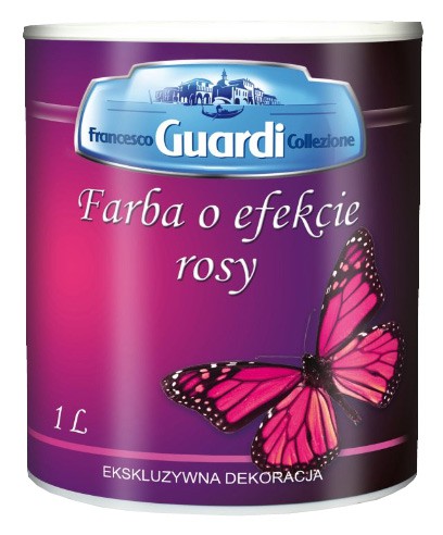 Farba o efekcie rosy Francesco GUARDI Collezione jest nowoczesną farbą akrylową zawierającą ściśle wyselekcjonowane szklane wypełniacze i pigmenty metaliczne. Dzięki swojej charakterystyce farbą można dekorować wnętrza zarówno klasyczne, jak i te utrzymane w stylu modernistycznym.