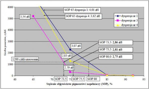 Jak widać przy oczekiwanej odporności na szorowanie w granicach 1200 cykli posuwów, najtańszą w kosztach wytworzenia okazała się farba na najdroższej dyspersji polimerowej (nr 1). Dzięki wysokiej wytrzymałości powłoki na tej dyspersji możliwe jest podwyższenie SOP przy zachowaniu wymaganej wytrzymałości powłoki na szorowanie.