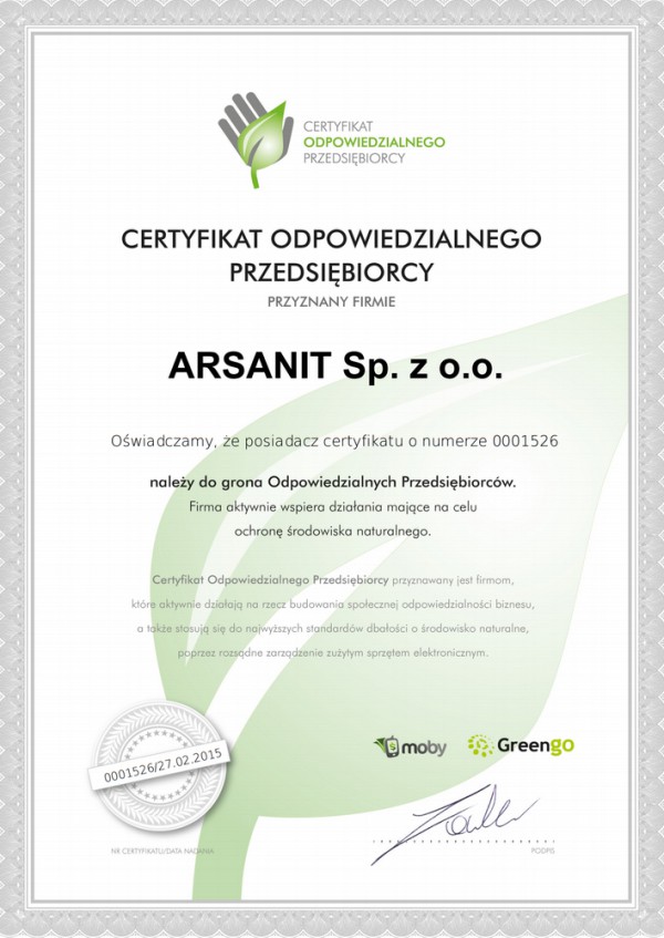 Ekologia jest wpisana od początku w strategię działań firmy ARSANIT. Wierzymy, że prowadząc społecznie odpowiedzialny biznes, mamy realny wpływ na poprawę sytuacji otaczającego nas środowiska. A wyróżnienie w postaci Certyfikatu jest dla nas nieocenioną motywacją do dalszej pracy w tym obszarze.