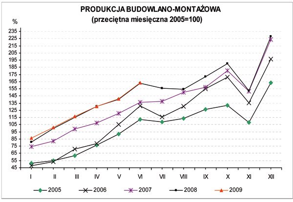 Kształtowanie się dynamiki produkcji budowlano-montażowej, w porównaniu z przeciętnym miesięcznym poziomem 2005 r., ilustruje poniższy wykres: