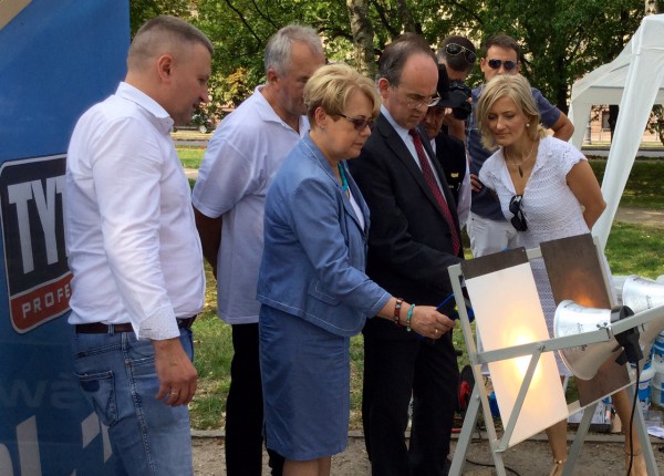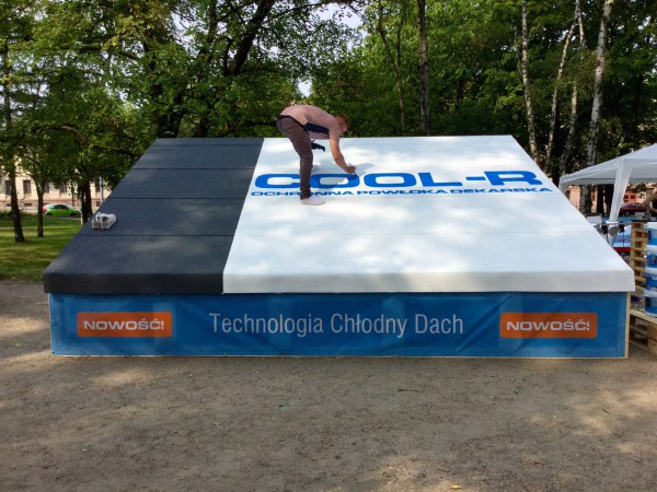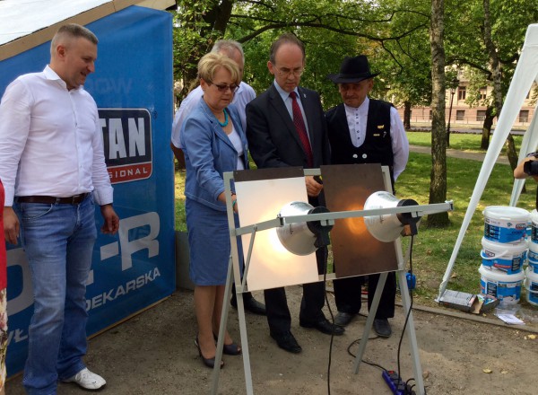 Fot. Selena W zewnętrznej strefie testów – łącznie na czterech stoiskach, fachowcy z branży dekarskiej oceniali właściwości produktu na dwóch modelach blaszanego dachu – jeden pokryto warstwą COOL-R, drugi pozostał bez zabezpieczenia - obydwa poddano działaniu specjalnej, rozgrzewającej lampy. Po kilkunastu sekundach od włączenia lamp, dokonano pomiarów temperatury spodniej strony obu powierzchni. Bezkontaktowy termometr na podczerwień (pirometr) wykazał co najmniej 2-krotną różnicę temperatur. Blacha niepokryta COOL-R osiągnęła temperaturę 85-90 st. C, a blacha pokryta COOL-R 37-45 st. C. Kolejne testy wykazały, że różnice temperatury pomiędzy powierzchniami blaszanymi i równolegle testowanymi - bitumicznymi, a temperaturą powierzchni pomalowanej ochronną powłoką dekarską COOL-R, wyniosły ok. 50-60%. Stanowiska testowe cieszyły się ogromnym zainteresowaniem, bowiem pozwoliły na bezpośrednią ocenę parametrów produktu. Dekarze potwierdzali łatwość i szybkość aplikacji oraz krótki czas schnięcia. Mogli się także przekonać, że nakładanie 2-giej warstwy w relatywnie szybkim czasie, umożliwia wykonanie gotowej powłoki ochronnej i antyrefleksyjnej COOL-R.